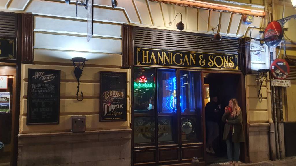 The final pub is Hannigan’s. Hannigan’s is an Irish Pub and wants you to know it . It’s the big dog here, and it is textbook. It trumps Paddy’s by being more than a room , its horseshoe bar, stained glass , snugs all testament to its splendour. Hannigan’s, I find out is an Official Irish Pub , a kind of accolade in which a shady cabal of faceless apparachiks confer authentic status on Irish pubs in Iberia, literally my arch nemeses who in some later year will no doubt attempt to bump me off due to my investigative digging into the seedy underbelly of the Irish pub racket. The tunes at Hannigan’s are hopping though, and we finish the night signing along to poignant strains of the Youssou Ndour / Nenah Cherry 1994 English/ French / Wolof smash “7 Seconds”