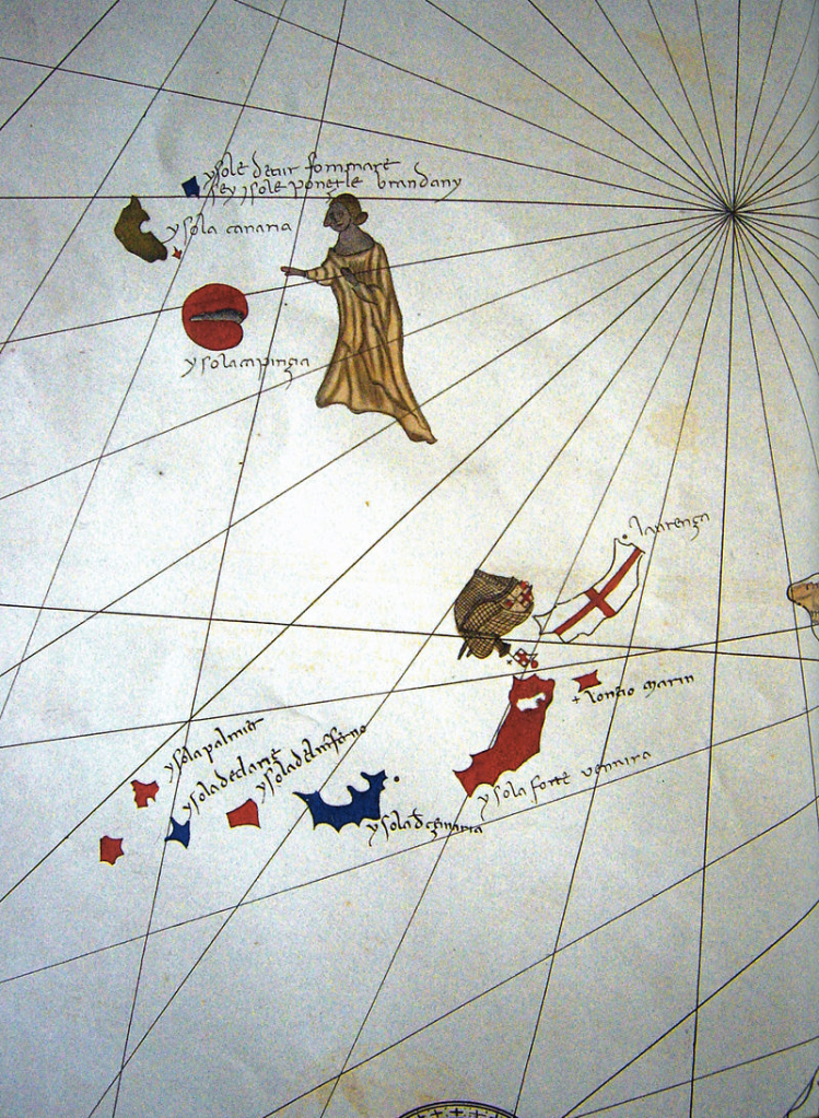 We know about Brendan from primary historical sources, notably from his own writings, the Nauigatio sancti Brendani abbatis which holds tales of woe and wonder as he set out into the Atlantic in a style of Irish nautical saga known as an Immram , in search of the wonderful isles of paradise . Knowledge of St Brendan’s Isles were passed on to important cartographers henceforth, and were included on various maps throughout antiquity around the Age of Discovery , situated at various points at sea somewhere in the mid-Atlantic .The Mapamundi of Hereford in 1275 included the Isles of St Brendan , and Magellan is thought to have named ‘SamBoromobon’ bay in Argentina after a crude Spanishisation of St Brendan.