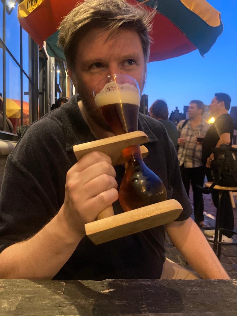 Ghent was a big deal in ye olde medieval times, growing wealthy on the wool trade. The town is dotted with grand cathedrals and belfries, testament to the wealth of the merchant class and leading to rampant Ghentrification. The town centre is a pretty little thing, with those diagonally built roofs and bridges like Amsterdam but with less piss smell. High atop the towering grand belfry is the symbol of Ghent, a golden dragon. The Gulden Draak is also the name given to the locally brewed ale that I purchase for Bella, when she wants something a bit lighter than the fare we’ve been partaking. Turns out to be the strongest beer we encounter all holidays. In the grand town square, there is an infamous pub ( non-Irish but ..) called Duile Griet , where they notably serve 1.5 litre flutes of beer, the deposit required for said vessel is one of your shoes. Normally, I’d be all over that shit, but its 32 degrees, I’ve had beer served with every meal, so I settle instead for something more low- key- a light n’ delicious 12% Kwak served in a hybrid-test-tube-egg -timer glass that I highly approve of. So far, not a single beer served in the non-approved glass ( or kitchen utensil).