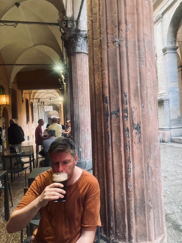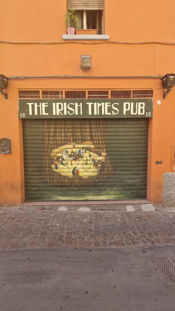 The second pub of Bologna is the Celtic Druid .The Druid is a great example of a foreign Irish pub, in that it is primarily for locals and students as distinct from being the exclusive haunts of ex-pats and reddened tourists. Almost everyone is Italian in here . So is it Irish? It has Harp, Bulmer’s, Smithwicks on tap, its wooden AF and they even do a Celtic Spritz, a glass of Bulmer’s with a glug of Apperol which is banging. Where the Irish pub becomes the alternative pub is the sweet spot , and the Celtic Druid is busy almost every night. I tell the barman that I really like this place ,and show him pictures of this blog and website , telling him of my mission. ‘Oh shit man’ he says apologetically , ‘let me fix your Guinness‘, and he takes back the pint he had pulled, reduces the head, tops it up again, wipes down the glass and hands it to me with reverence. I’ve truly made it. Lamentably, there is one final Irish pub, The Irish Times, with an amazing wee bar front and a fab mural- however it has closed for 2 weeks for the Ferragosto when all Italy goes on a quick hol. Couldn’t imagine a pub in Ireland deciding to close for 2 weeks, but we must respect tradition.