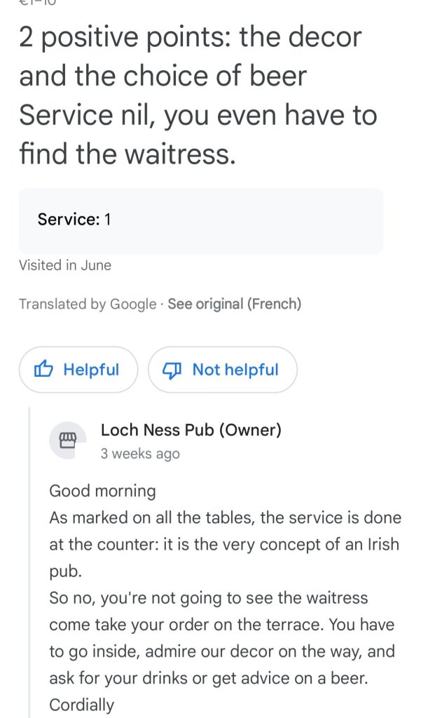 Its fine. First things first, its not an Irish pub. It’s an Irish homage pub. It’s a pastiche of an Irish pub. (At what point does homage become pastiche?) On the reviews off of Google, the owner himself states ( see pic below) :