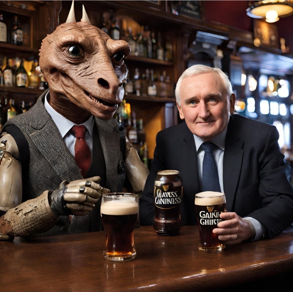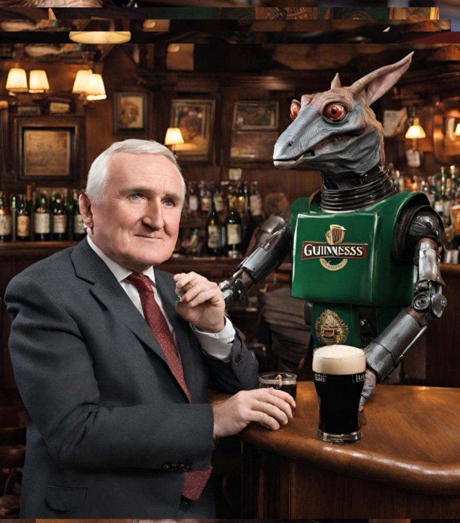 Ok , first attempt for the AI to generate the Irish pub o’ the future Robots with pints -now we are talking Pint a bit off, but this is the future Wait….hang on …who’s that …What the….The algorithim has gone full Bertie-pilled!!!