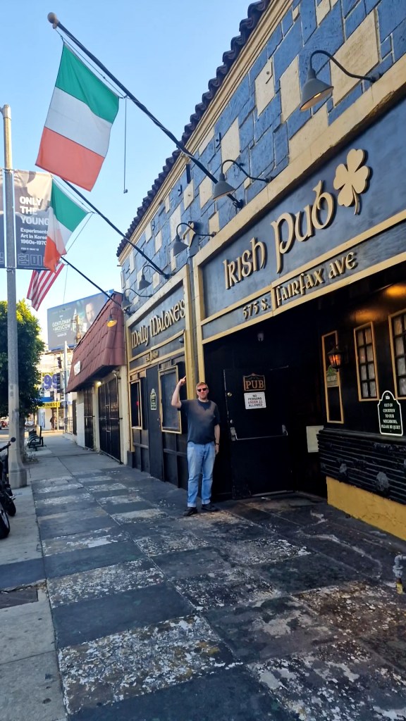 Understandably, there was much trepidation on visiting the first ever American Irish Pub in Publican Enemy History. Slagging off America’s Irish fixation is fish in a barrel, so I endeavored to choose what hopefully was LA’s best, most authentic Irish Pub and avoid the Paddy O’Houlihan’s Sports Bar n’ Craic Factories of the world. A high stakes journey, as anyone who’s tried to drive across LA can testify. My choice was Molly Malone’s, of Fairfax. Despite being the 1000th Molly Malone’s I have visited , this one has a number of promising signs that it might be legit. It’s got no natural light , despite it being perma- sunny here, which helps massively in creating the Irish vibe. There are long wooden benches and even a demi-snug at the end , which we make for instantly. Molly Malone’s was founded in the 1960s, which is also usually a very good sign as it’s prior to the great commodification of ‘Orish Pubs in the 90’s. According to its website, its where they recorded scenes from such iconic films as Leaving Las Vegas , Patriot Games and Leaving without Dick. Must have missed that last one. Also , legendary Proto-Celtic Punk band ‘The Flogging Molly’s’ started here and are named after the place, so respect the heritage. The pints are actually pretty damn fine and I am impressed overall with the whole frickin’ operation. I can’t remember how much they cost , ’cause you have to factor in exchange rates and also for the first time, tips. I may be an accomplished traveler and genuine homme do monde, but I ain’t never tipped a bar person , not even if they were slinging out multiple free pints, nor if they rescued my first born child from a fire, but who am I to go against the grain and tradition of this land ? If you are gonna tip the barman for pintas though , they better be pretttttttttty decent. And luckily they are – perhaps the best in the West , you could say. Molly’s is undoubtedly a shining beacon of Irish American Taverns . Some of the local alternatives on the Sunset Strip, namely “Jameson’s Irish Pub ” and “Rock & Rileys” are described by local friends as ‘ touristy heaps of crap’, so the gamble sure paid off .