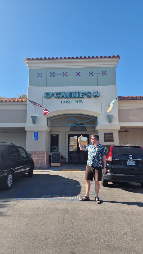 Palm Springs, located some 2 hours east of Los Angeles, has a distinct Flintstones aesthetic , from its palm trees to its rounded stone bungalows to its foot powered cars with dino-heads sticking out the top . It was was a playground to the rich and famous in the 1950’s& 60’s , a kind of hideout from LA, away from the prying eyes of reporters and today has a huge LGBTQI+ Community. Frank Sinatra is also buried around somewhere (in a cemetery, not just in the middle of the desert). In some random desert strip mall with promises of both ceol & craic, we find O’Caines – not just IRISH, but the Irish-est pub in existence! In O’ Caines, more is more, and they have gone whole hog and packed the place with every Irish thing they could humanly affix to the walls. It even has a gift shop for Irish gifts, including Gardaì cuff links and hundreds of plaques, posters, and even a 200-year-old statue of St Paddy. If you wanna get down, right down on the ground – O’Caines! The place must be the largest Irish pub I’ve been to, which is odd as it’s the only one located in a desert. Apart from those in Bray, which to be fair is more of a cultural desert. (You can read bout this and other American Irish Pubs here https://publicanenemy.com/2024/06/01/publican-enemy-the-usa/ )