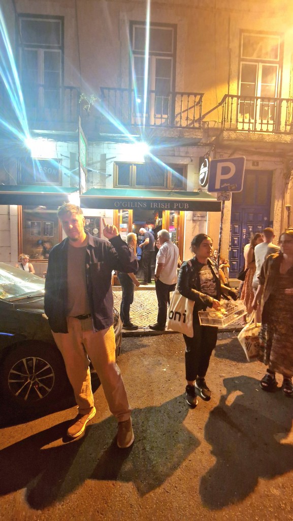 If prompt service is a cornerstone of any Irish pub, then these gals are navy seals level. As soon as you merely contemplate the possibility of getting another drink., they appear beside you ready to dispense their hooch. The pint is expensive, at €7.35, but admittedly it was muito bom. Quickly the place becomes rammed, and there’s no possibility of going around taking pictures of the wall tat as is my wont because it’s poppin’ off. Within minutes, the place is gone mad, and old, young, even the on- Tour Indoor bowls team from Dusseldorf are getting into it. There’s no room to move but somehow, through a gap between someone’s elbow, the waitress gal magics her way through- “you want one more?”. In a jam-packed pub, I don’t have to queue for the bar once, which is incredibly impressive. This being Portugal, its only really kicking off at about 1:00 AM. A mix of Irish Bar know-how and Lusitanian zest means it’s one of the best nights ever in an Irish Pub abroad. I try to record a video to capture the moment but each video is drowned out by the hordes belting out Oasis and I am too drunk . Everything you’d want from an Irish pub in one of Europe’s finest cities and a grand night out.