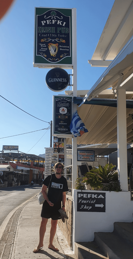 Pefki Irish pub certainly lives up to its billing by being an Irish pub in Pefki. Pefki was a small unassuming fishing village up until the rise of mass tourism and is now just a unremarkable generic resort town. Pefki Irish pub then is exactly how you’d imagine an Irish pub would be in a generic tourist resort town . So what does it have ? Its got a Feck it License plate , a framed picture of Elvis for some reason and the 1916 Proclamation on the wall . “ Many people take a photo of that…I don’t know what it is “ the Greek barman says. Punters slowly start to trot in wearing Hawaiian shirts and garlands and bored kids drink mocktails and watch the transfer news on Sky Sports News. But you’re not here to discuss the similarities between Rhodean art deco facades and Boho recherche-Rococo stonework patterns , you’re here to have a pint and go pink in the sun. Which is what I do. As we walk away from Pefki Irish Pub, I note in the distance the unmistakable murmur of Garth Brooks ”Friends in Low places ” as it dribbles out of the sound system , mixing seamlessly with the bleating of the wild goats grazing on the periphery of the town. Lovely.
