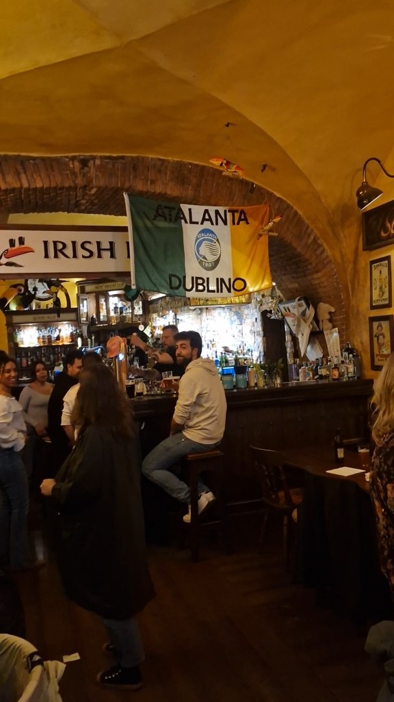 Pogue Mahone’s is a corner local bar in Porta Romana ,taking it’s name from the seminal Irish band and of the beautiful Gaelic phrase ‘Kiss my arse.’ We arrive on a busy night – the Derby de la Madonnina, where AC Milan of Milan take on Inter Milan of Milan in the ole’ calcio. Pogue Mahone’s is another perfect fusion of Irish/ Italian Pub authenticity . The legendary Shane McGowan himself drank here, looking pale and pallid as per in a pic on the wall . They sponsor the Milan GAA team and have a range of triggering Pro-Cork merch behind the bar . There’s a rowdy front bar, a snug back bar, and full restaurant across the road. The walls depict legends of Irish culture, including Brian O’ Driscoll who I suppose deserves to be there despite not fitting the an iconoclastic rebel remit . Guinness is poured efficiently and reasonably priced, and there’s even Murphy’s, while Bella sticks to the wonderful digestif, amaro .The local clientele hover outside drinking their pints standing in a very Irish style , apart from a moped outside becoming a makeshift table for resting pints on. Like the Tucan’s, the attention to detail here is impressive,and maybe that’s what makes this area the world leader of beautiful design? And this luckily has extended to 2 of the best Irish Pubs money can buy so far on this trip . Bravi Ragazzi!