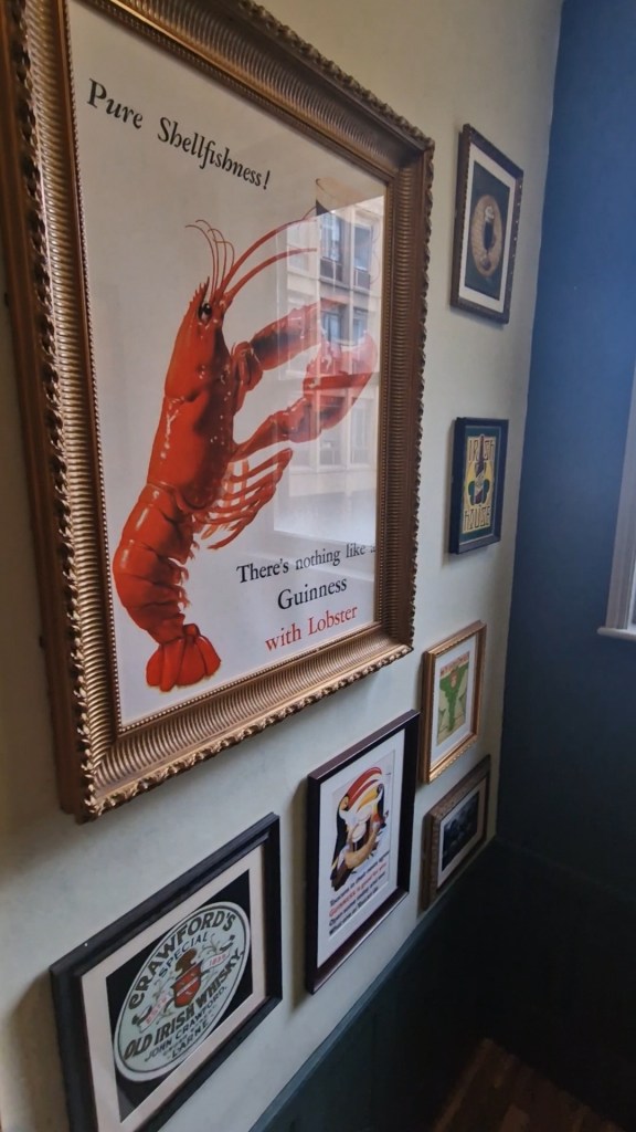 And so, yesterday while walking home from Bloomsbury after taking a wrong turn, I spotted 2 glorious tricolours fluttering in the gentle summer breeze from a salty looking alehouse I had ne’r seen before. On closer inspection, unbeknownst to my good self, in walking distance of the office is a Proper Authentic Irish Pub (TM) right in the heart of town. As shown above , the Guinness to start was indeed of the finest quality. Meanwhile, vis a vis decor, you have a Crab offering to have a pint with you (top right) , always a plus. Live music, road signs and Taytos complete the bingo card of Authentic Irish Paraphernalia in this haunt of post-work drinkers and students from the myriad of nearby Uni’s. The College Arms has been an education in a fine pub ambiance and a testament to the act of wandering the wrong way home. Get Lost people.