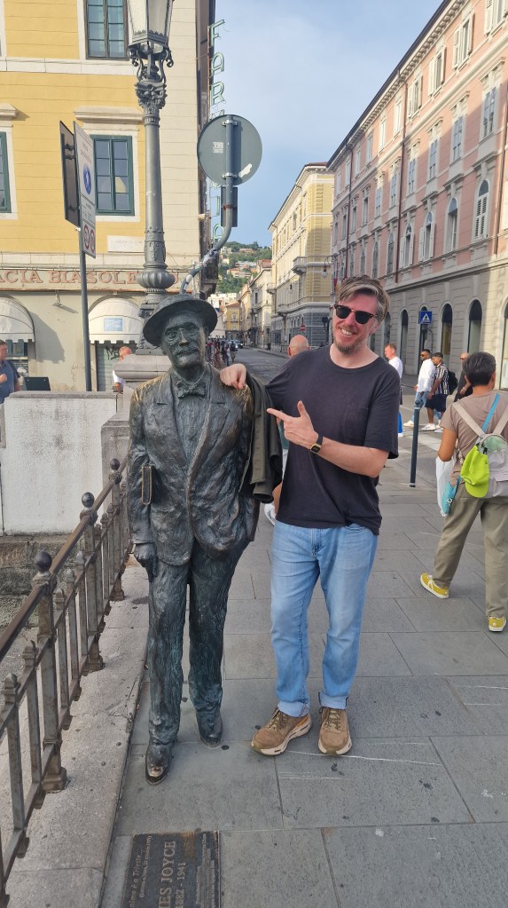 Modern Trieste is the Joyciest Place on Earth. My trusted attorney and man not without culture Mr Tom Mayer joins me as we stay in the James Joyce Hostel, see the James Joyce statue on James Joyce Walk , peruse the James Joyce Merch in the Cafe Pirona he frequented, admire the James Joyce Theatre and enjoy the fried kidneys n’ onion street food from the Joycean-themed stall JJ’s . All of those are real except the last one. There are walking tours highlighting Joyce’s many many abodes in the city , having moved around about 15 times, absconding each time because he couldn’t pay his rent. While working as an English Teacher ( a noble profession reserved for the cream of society), he met Italo Svevo, (real name Ettore Schmitz) , the noted Italian writer whom Joyce probed for his Jewish perspective , helping form the outline of Ulysses’s protagonist Leopold Bloom.