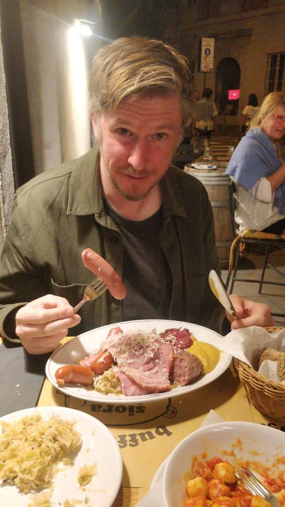The local cuisine is ham heavy, with an österreichischian kraut n’ bier emphasis. Many of the trad restaurants here are buffets, a kind of canteen for dockers with mounds of boiled ham, ham, sausage, ham-hocks, ham chunks , boiled ham, ham ham eggs and ham, kraut, horseradish,mustard and an aul bit of bread. I sample this local specialty, the Piatto di caldaia (from the cauldron) on the first night here, my night’s slumber crudely ravaged by ham-fever dreams of Joycean lust too warped and lascivious to record here. Just as the Mesoamerican shamans of the Zapotec and Olmecs would take mind altering psychotropic substances to produce visions for their sacred texts, perhaps Joyce developed his signature stream of consciousness from a similar night on the ham and its accompanying nocturnal porcine digestive visions. It’s a theory, people!!