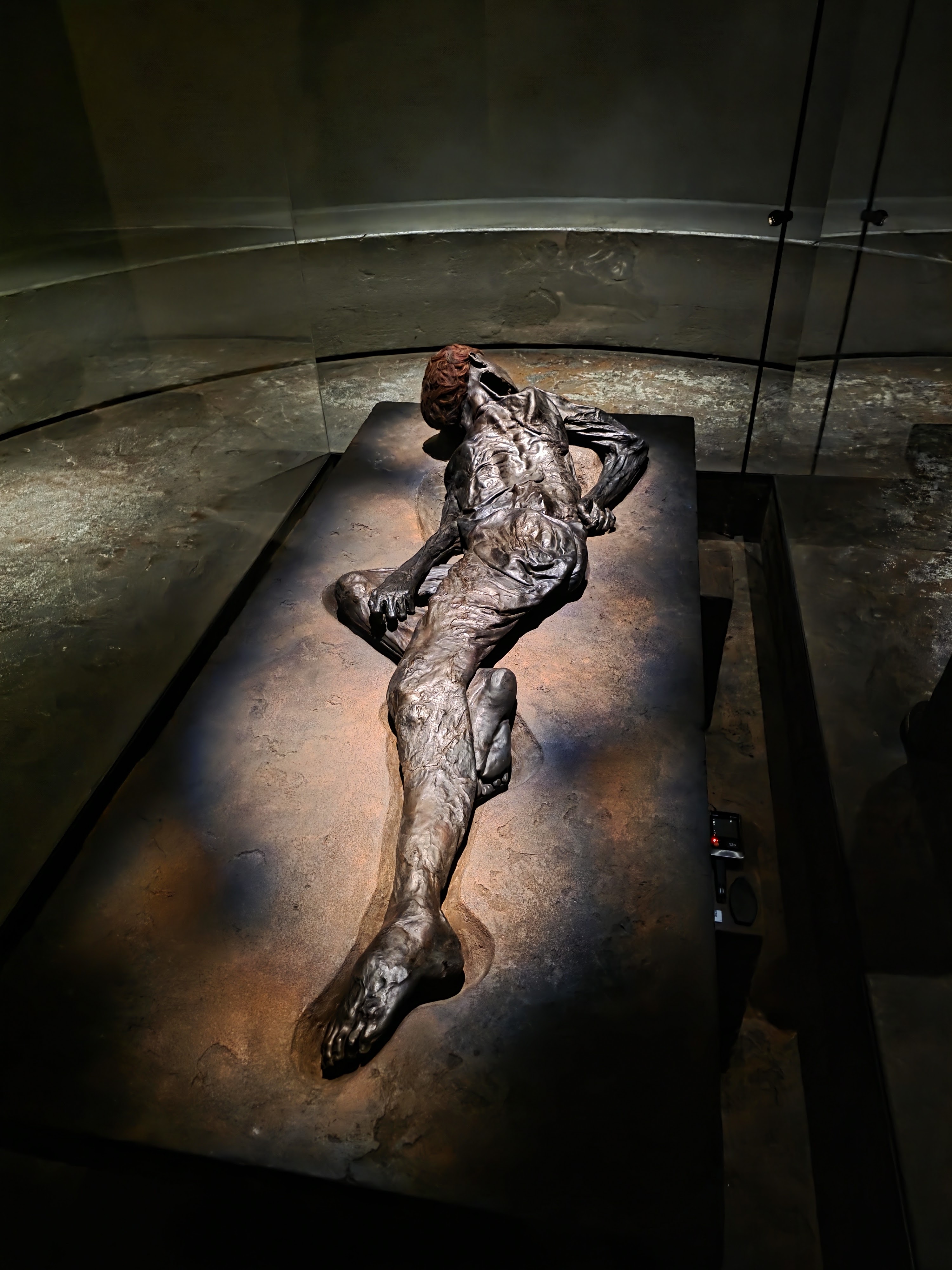 We may not be able to live forever, a lá Oisin of Tir na Nog fame , but in Aarhus you can meet a guy who’s 2000 years old. On my final day, I go south to meet Graubelle man, a Celtic bog body preserved in time. And in a bog. Graubelle man is said to have been a human sacrifice thrown into a marshy …marsh , which would have had some impact the ole’ Happiness Index I reckon. We are not sure as to why he was chosen for this grim fate- perhaps he dishonored the gods by failing to satisfactorily split some sort of primitive ‘G’? We may never know. But we do know what he ate. Researchers carried out detailed analysis on the still preserved contents of his stomach to see what his last meal was. Turns out he had a hot dog in a baguette and a chocolate milk . No, it was actually some sort of grainy mulch.